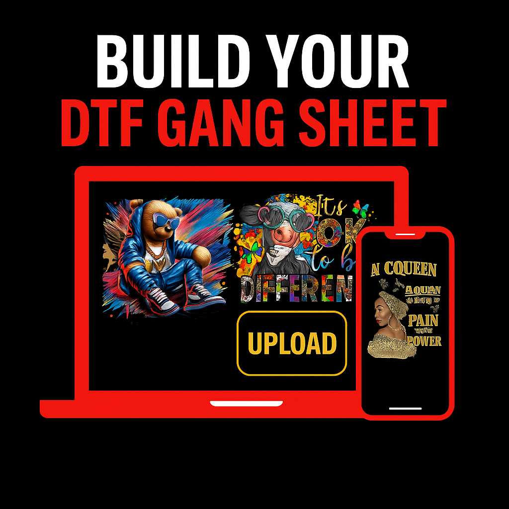 Welcome to the easiest way to order custom DTF transfers — simply build your own gang sheet using our intuitive online builder. Whether you're a small business, apparel brand, or reseller, our gang sheet option helps you save time and money by combining multiple designs into a single print area.